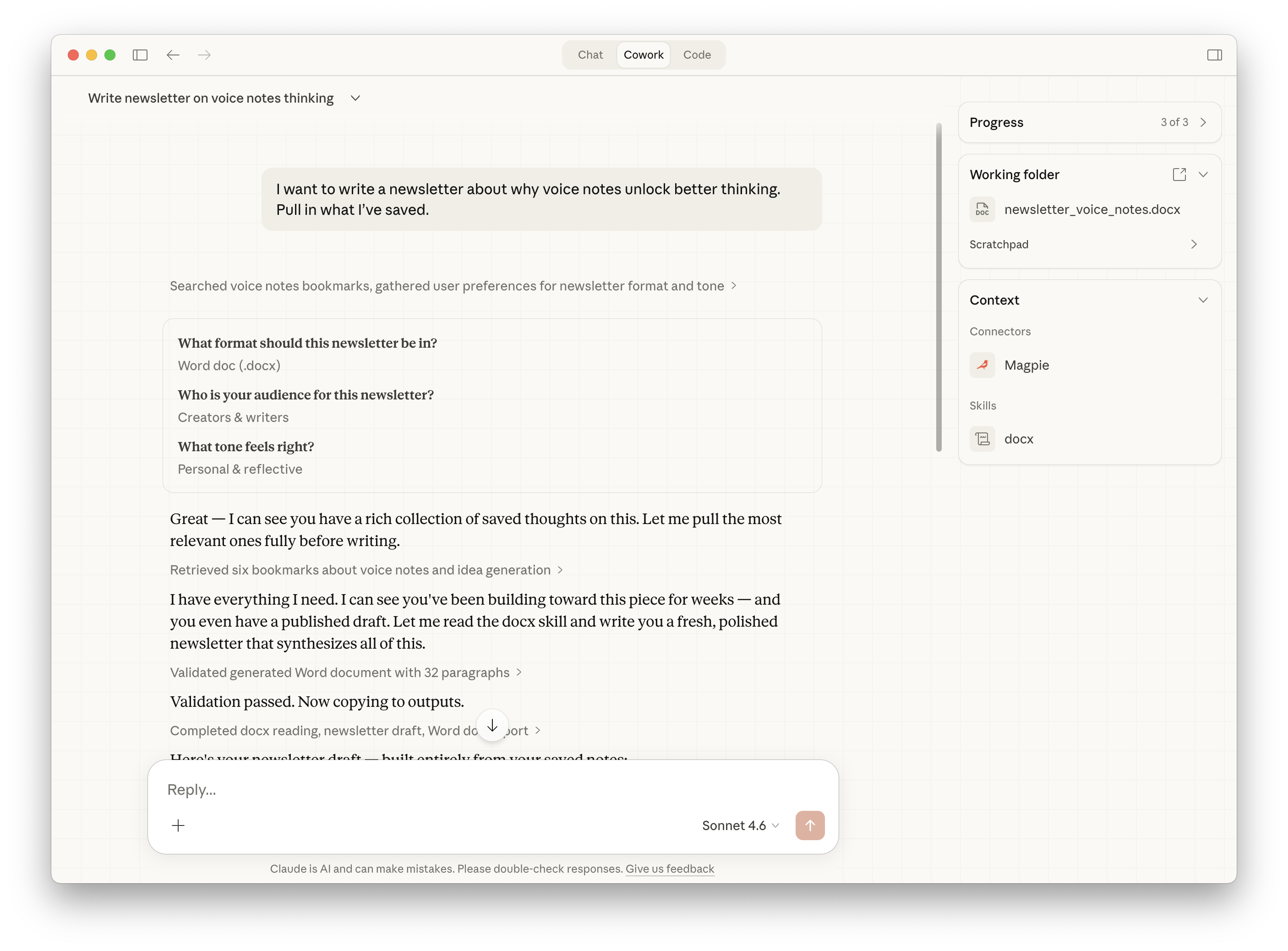 When you’re ready to go from thinking to making, Cowork creates the actual file.